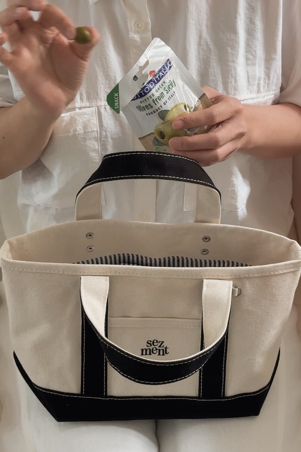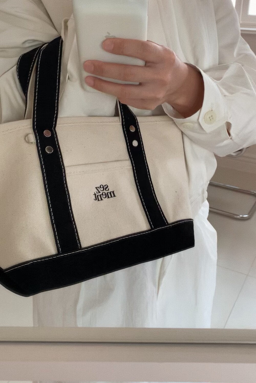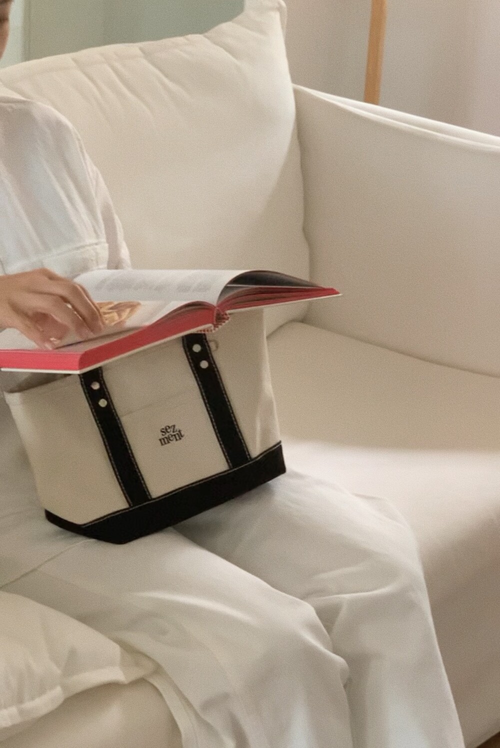 다양한 소재의 면원단을 조합하여 만들어진 가방으로 기계 세탁과 건조기 사용시 틀어질 수 있으니 주의해주세요.