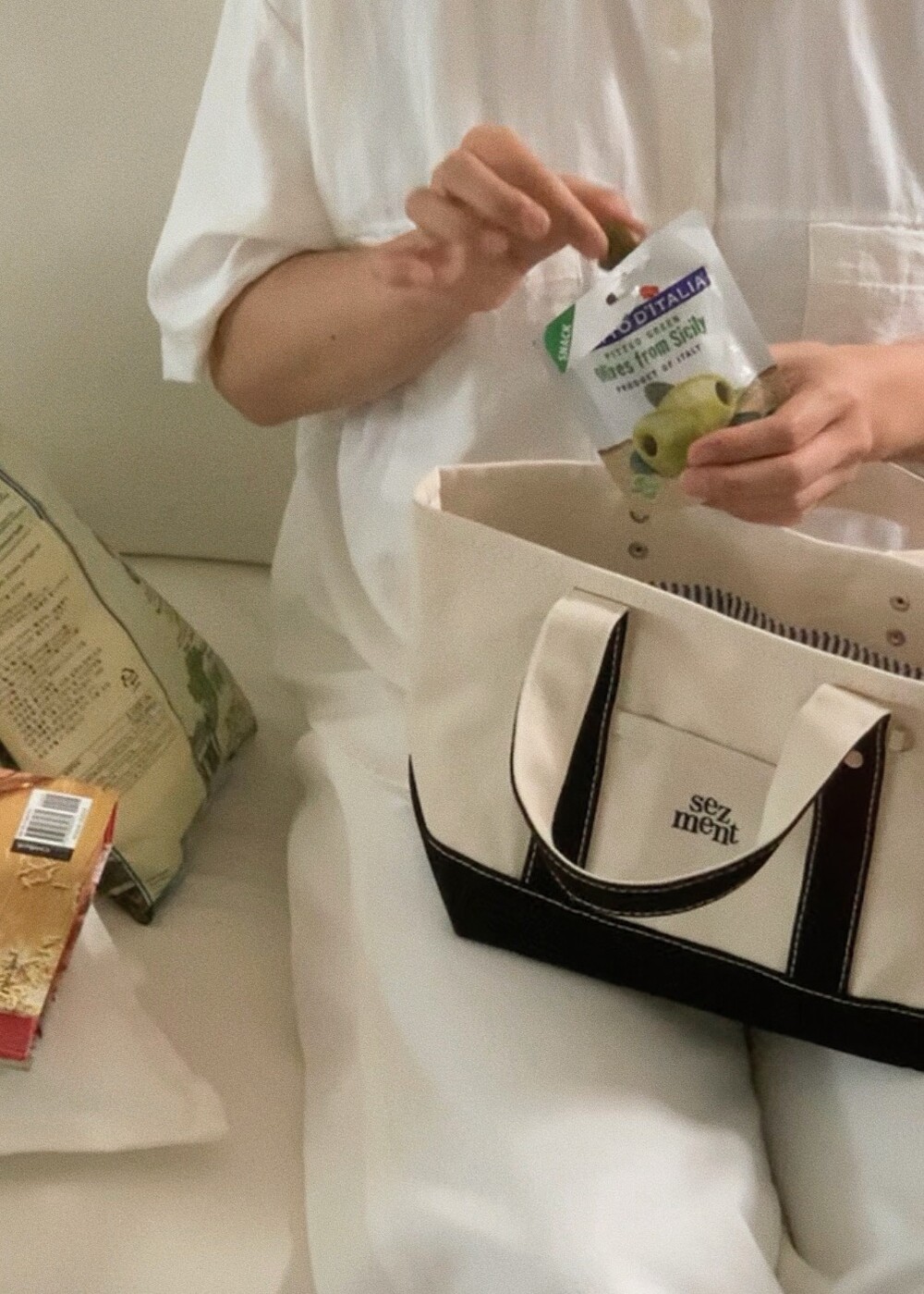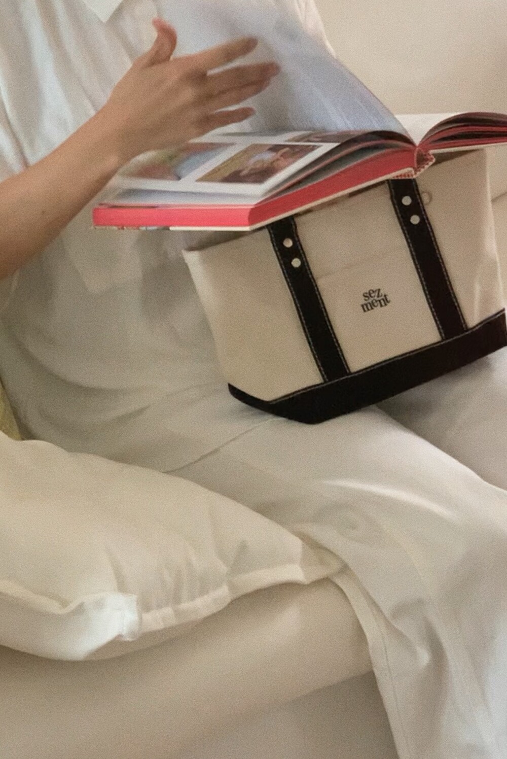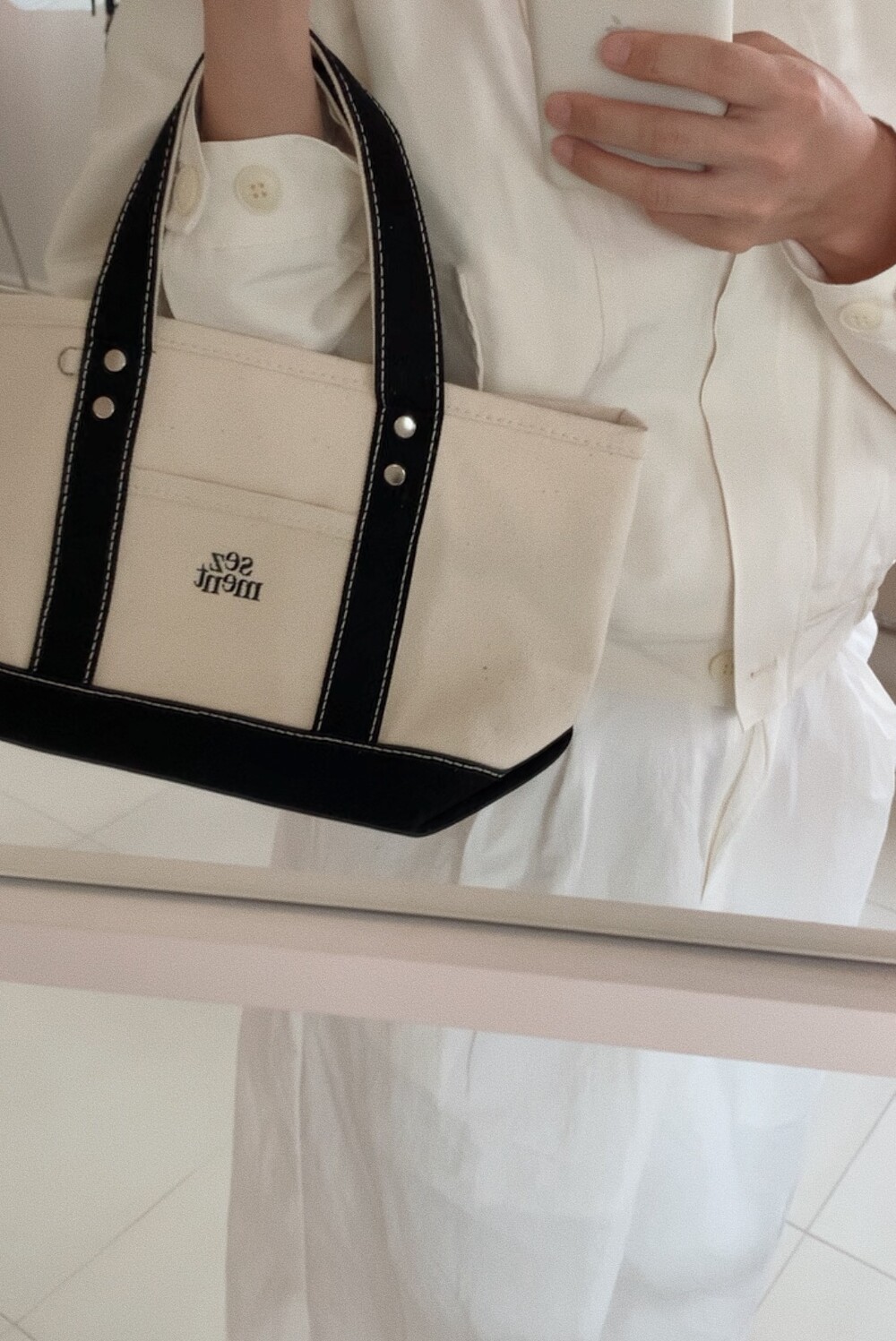 다양한 소재의 면원단을 조합하여 만들어진 가방으로 기계 세탁과 건조기 사용시 틀어질 수 있으니 주의해주세요.